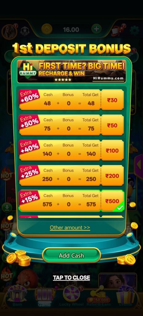 आज के time में बहुत सारे platforms high deposit push करते हैं, लेकिन real players जानते हैं कि blind high entry अक्सर loss भी बढ़ा सकती है। Hi Rummy इस pattern को break करता है। यहाँ ₹13 से ₹138 तक का welcome bonus user को एक flexible शुरुआत देता है—मतलब user खुद decide कर सकता है कि वह कितना risk लेना चाहता है।