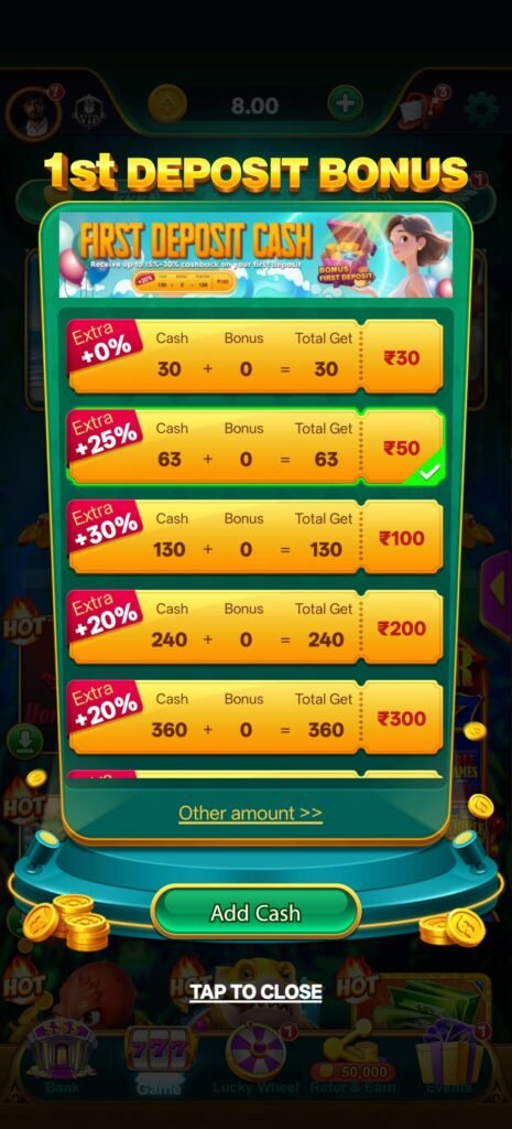 ₹8 से ₹33 तक का welcome bonus entry को basic रखता है—मतलब यहाँ शुरुआत में ज्यादा expectation set नहीं की जाती। यही इसकी असली खासियत है, क्योंकि user शुरुआत से ही समझ जाता है कि उसे खुद gameplay build करना होगा। ₹30 deposit पर 0% bonus इस बात को और clear कर देता है कि यहाँ हर चीज़ easy नहीं मिलने वाली। लेकिन जैसे ही user आगे बढ़ता है, ₹50 पर 25%, ₹100 पर 30% और फिर ₹200 और ₹300 पर 20% bonus मिलना शुरू होता है—मतलब system धीरे-धीरे support देता है, लेकिन पूरी dependency नहीं बनाता।