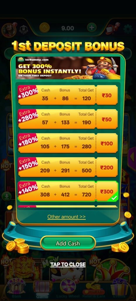 लेकिन इस platform की असली पहचान इसका high-impact deposit bonus structure है—₹30 पर 300%, ₹50 पर 280%, ₹100 पर 180%, ₹200 पर 150% और ₹300 पर 140%। यह clearly दिखाता है कि system user को शुरुआत में aggressive boost देता है, ताकि वह जल्दी gameplay में involve हो और strong position बना सके।