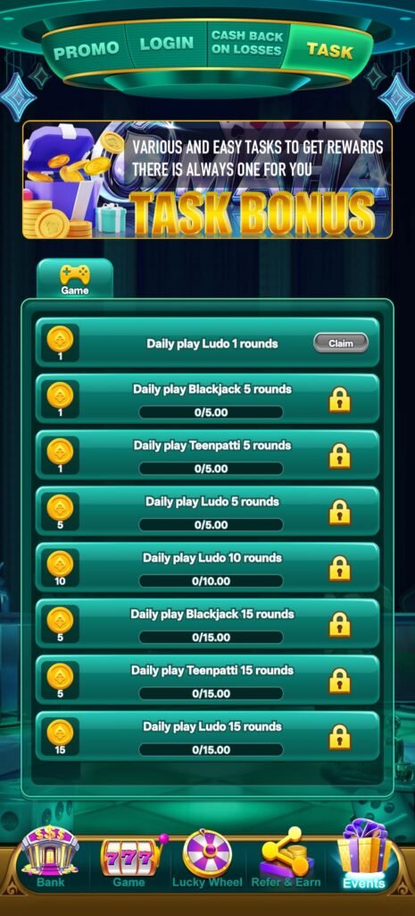 इसके साथ login gift, task system, lucky gullak, lucky wheel (₹200 deposit पर), rewards today और promo system मिलकर एक ऐसा ecosystem बनाते हैं जहाँ user अगर regular रहता है, तो धीरे-धीरे उसका overall फायदा build होता है।