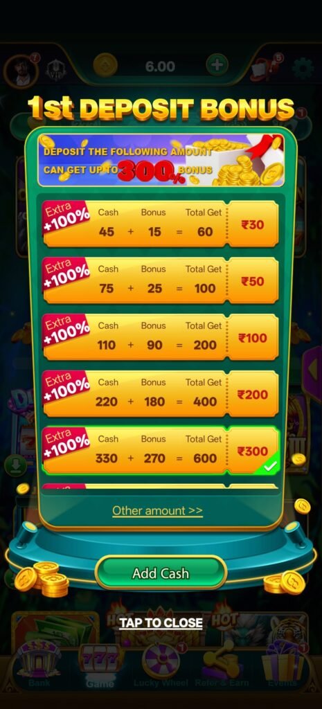 लेकिन इस platform की असली ताकत इसका uniform deposit bonus system है—जहाँ ₹30, ₹50, ₹100, ₹200, ₹300—सभी पर 100% extra bonus मिलता है। इसका मतलब है कि user को हर level पर equal मौका मिलता है, और gameplay एक balanced तरीके से आगे बढ़ता है।