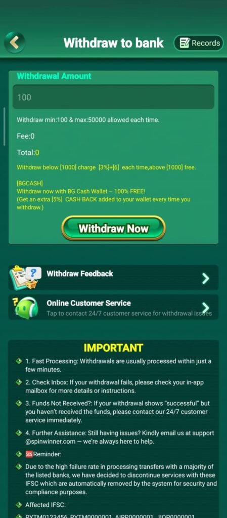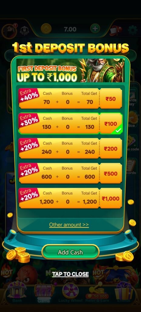 इस platform का deposit bonus structure भी बहुत clear और controlled है—₹50 पर 40%, ₹100 पर 30%, ₹200 पर 20%, ₹500 और ₹1000 पर 20%। इसका मतलब साफ है—यह platform user को शुरुआत में थोड़ी मदद देता है, लेकिन धीरे-धीरे उसे खुद gameplay control करने के लिए छोड़ देता है। यहाँ dependency bonus पर नहीं, बल्कि user strategy पर होती है।