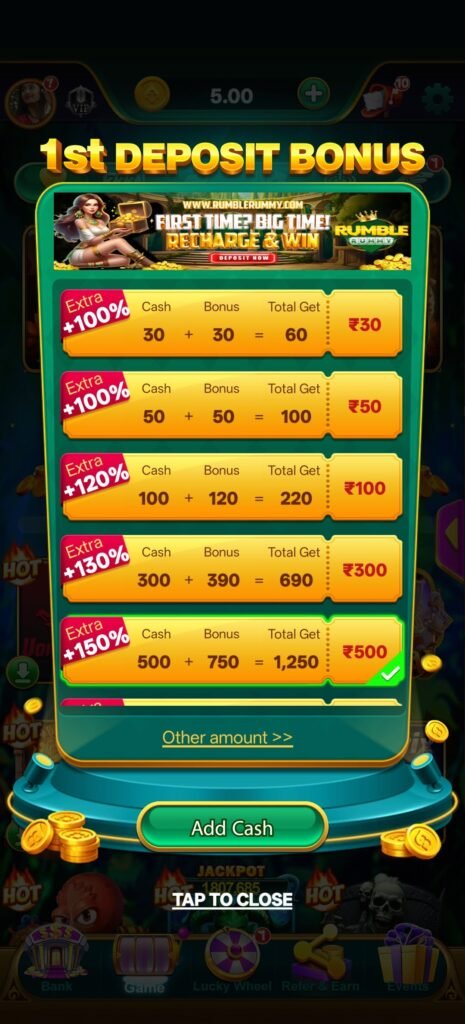 आज के time में users सिर्फ timepass नहीं चाहते—उन्हें चाहिए challenge। ऐसा gameplay जहाँ skill test हो, pressure feel हो और जीतने पर real satisfaction मिले। Rumble Rummy इसी mindset को target करता है। ₹5 से ₹77 तक का welcome bonus user को एक smooth शुरुआत देता है, जिससे वह धीरे-धीरे इस competitive environment में enter कर सकता है।
