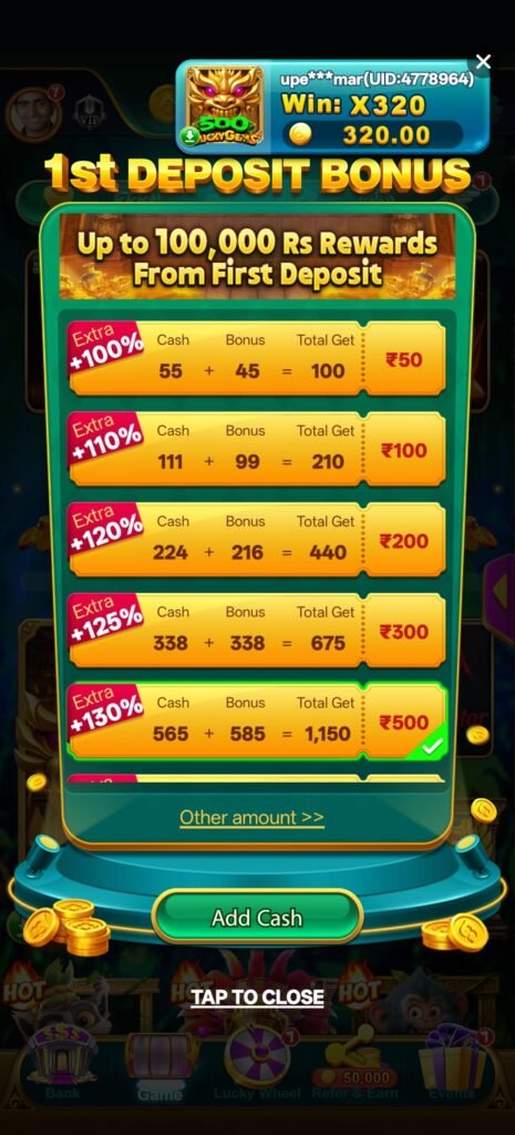 इस platform की असली ताकत इसका progressive deposit bonus system है—जहाँ ₹50 पर 100% से शुरू होकर ₹500 तक 130% bonus मिलता है। इसका मतलब है कि user को जैसे-जैसे confidence आता है, system उसे और ज्यादा reward देता है। यह एक clear level-up structure बनाता है।