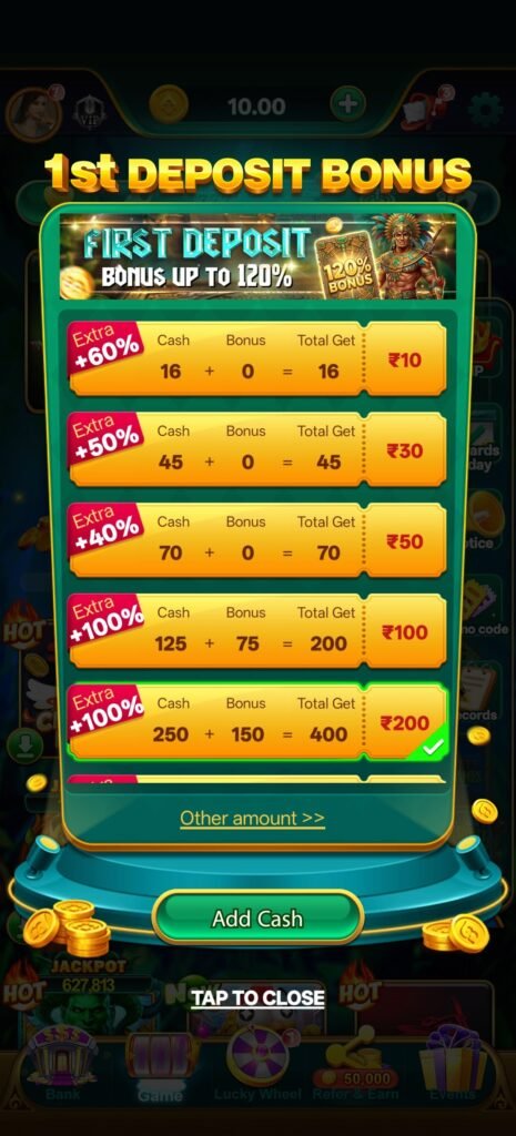 इसके बाद जैसे-जैसे user gameplay में आगे बढ़ता है, उसे अलग-अलग deposit पर extra bonus मिलने लगता है—₹10 पर 60%, ₹30 पर 50%, ₹50 पर 40%, और ₹100 व ₹200 पर 100% तक का bonus मिलना balance को जल्दी बढ़ाने में मदद करता है। इससे user को ज्यादा rounds खेलने का मौका मिलता है और gameplay experience और भी engaging बन जाता है।Platform पर task system, lucky gullak, lucky wheel, rewards today और promo offers जैसे कई features भी दिए गए हैं,