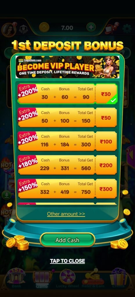 आज के time में users को सिर्फ instant reward नहीं चाहिए—उन्हें चाहिए progress। ऐसा gameplay जहाँ हर दिन खेलने से कुछ build हो, कुछ improve हो और कुछ नया unlock हो। Saga Slots इसी सोच पर बना है। ₹7 से ₹99 तक का welcome bonus user को शुरुआत में ही एक smooth entry देता है, जिससे gameplay धीरे-धीरे build होना शुरू हो जाता है।