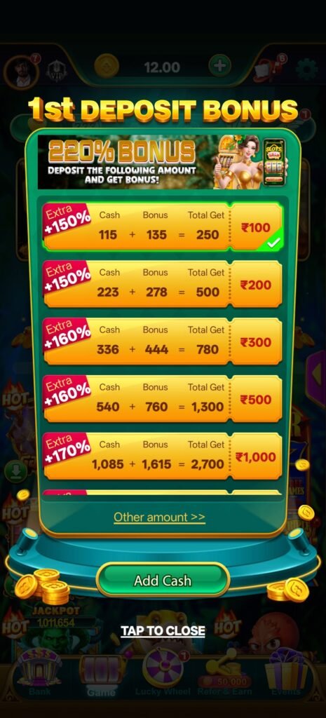 लेकिन इस platform की असली power इसका high-speed deposit bonus system है—जहाँ ₹100 से ₹1000 तक हर level पर 150% से 170% तक bonus मिलता है। इसका मतलब है कि user का balance जल्दी build होता है और gameplay long चलता है बिना बार-बार रुकने के।