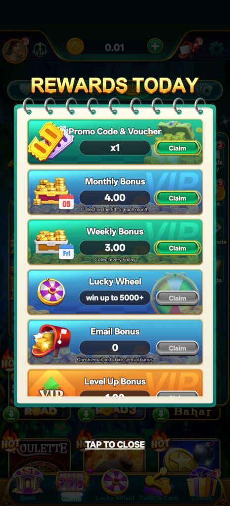 इसके साथ login gift, task system, lucky gullak, lucky wheel (₹100 deposit पर spin), rewards today, promo system और multiple game modes मिलकर एक ऐसा setup बनाते हैं जहाँ user को हर तरफ से छोटे-छोटे benefits मिलते रहते हैं।