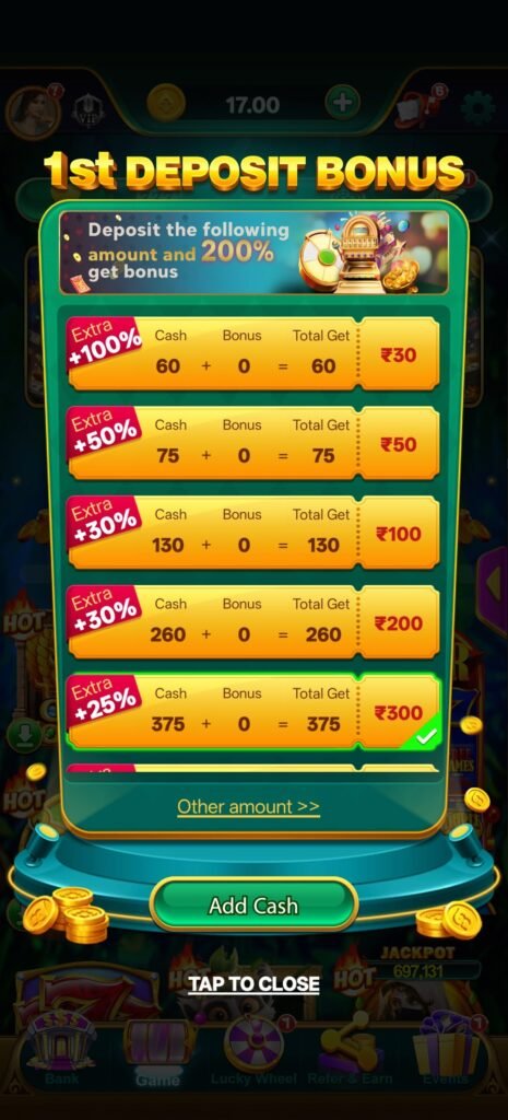 ₹30 पर 100% bonus—यह strong entry point है। लेकिन जैसे-जैसे amount बढ़ता है, bonus percentage घटता जाता है—₹50 पर 50%, ₹100 और ₹200 पर 30%, ₹300 पर 25%। यह pattern साफ दिखाता है कि platform शुरुआत में ज्यादा boost देता है, लेकिन आगे user को खुद control और strategy से खेलना पड़ता है।
