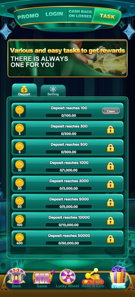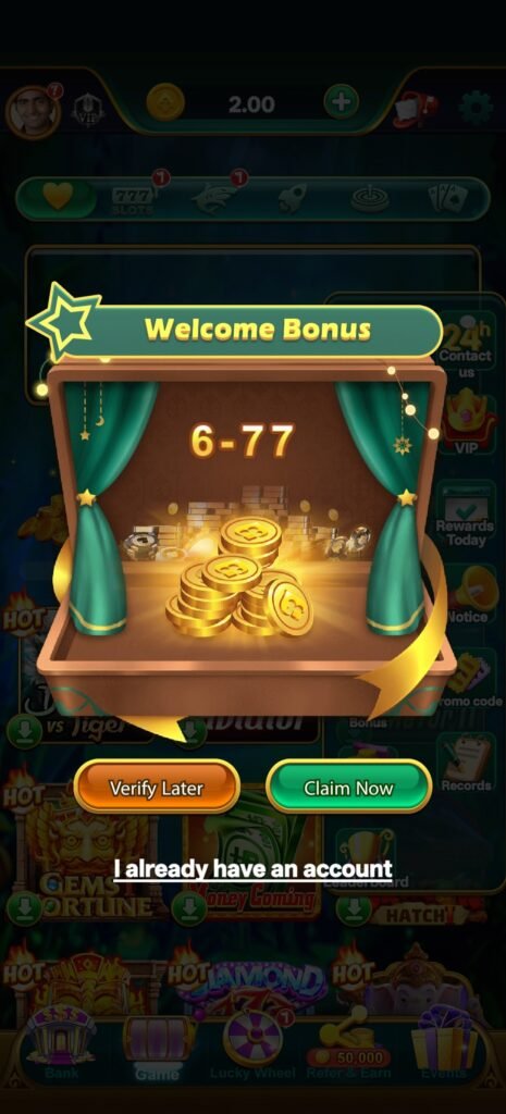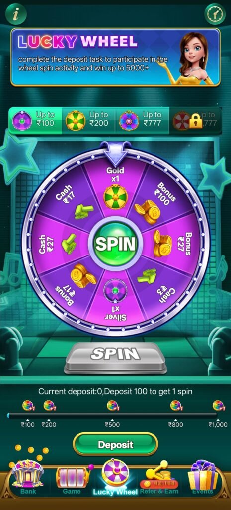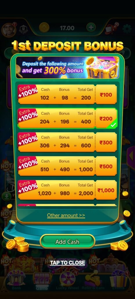 Game open करते ही ₹6 से ₹77 तक का welcome bonus मिलना शुरुआत को काफी flexible बनाता है। यह amount बड़ा नहीं है, लेकिन इतना जरूर है कि user बिना pressure gameplay शुरू कर सके। असली strength इसके बाद दिखती है—जब user deposit करता है। ₹100, ₹200, ₹300, ₹500 और ₹1000—सभी levels पर 100% bonus मिलना इस platform को directly powerful category में डाल देता है।