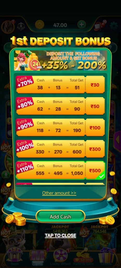 Game open करते ही ₹20 से ₹99 तक का welcome bonus मिलना entry को काफी comfortable बना देता है। यह amount इतना है कि user बिना hesitation gameplay start कर सके और game modes को explore कर सके। इसके बाद असली growth तब शुरू होती है जब user deposit करता है।